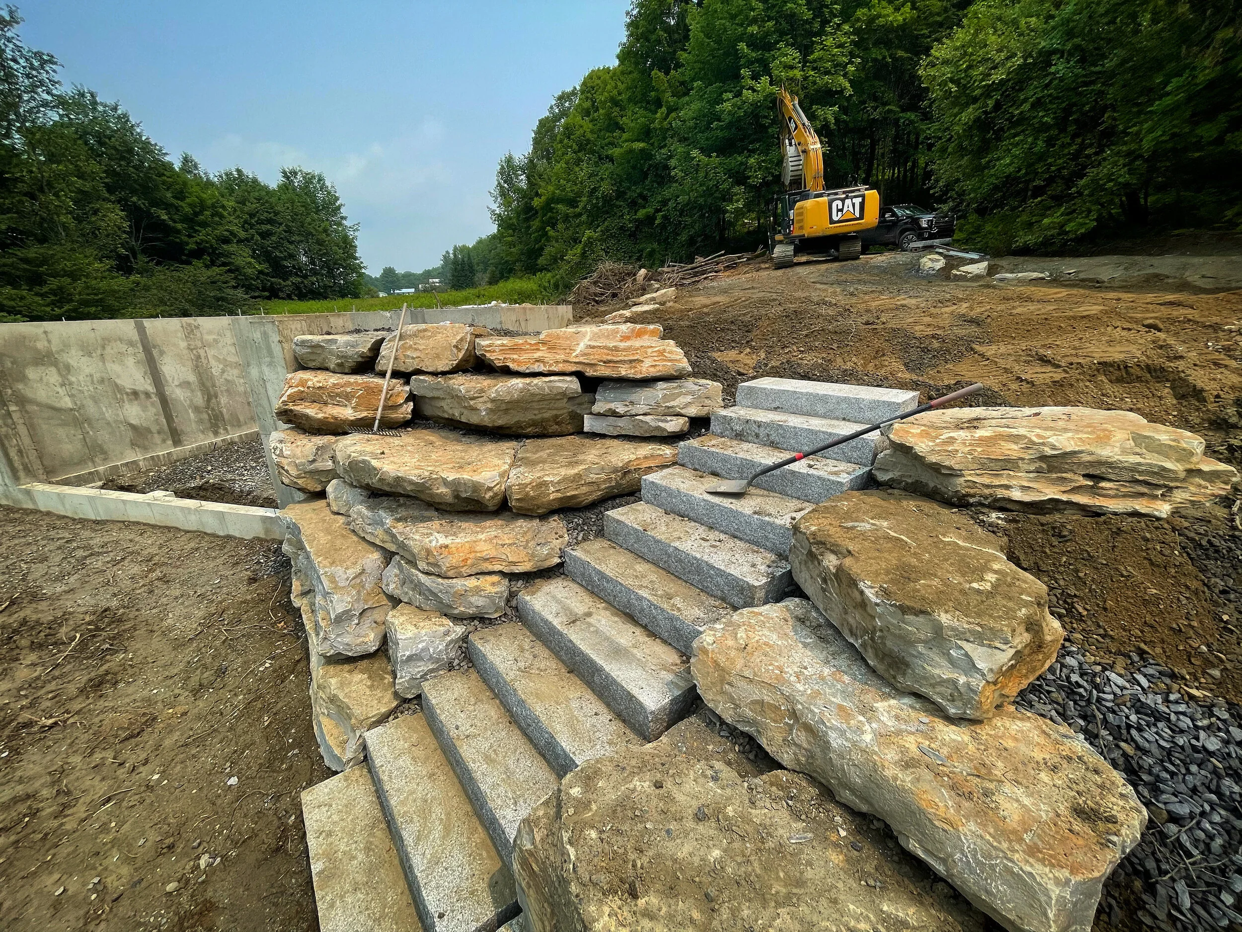Driveway Retaining Wall and Granite Stairway. Designed by Vermont Land Group. Installed by Aardvark Excavation. Waterbury, VT